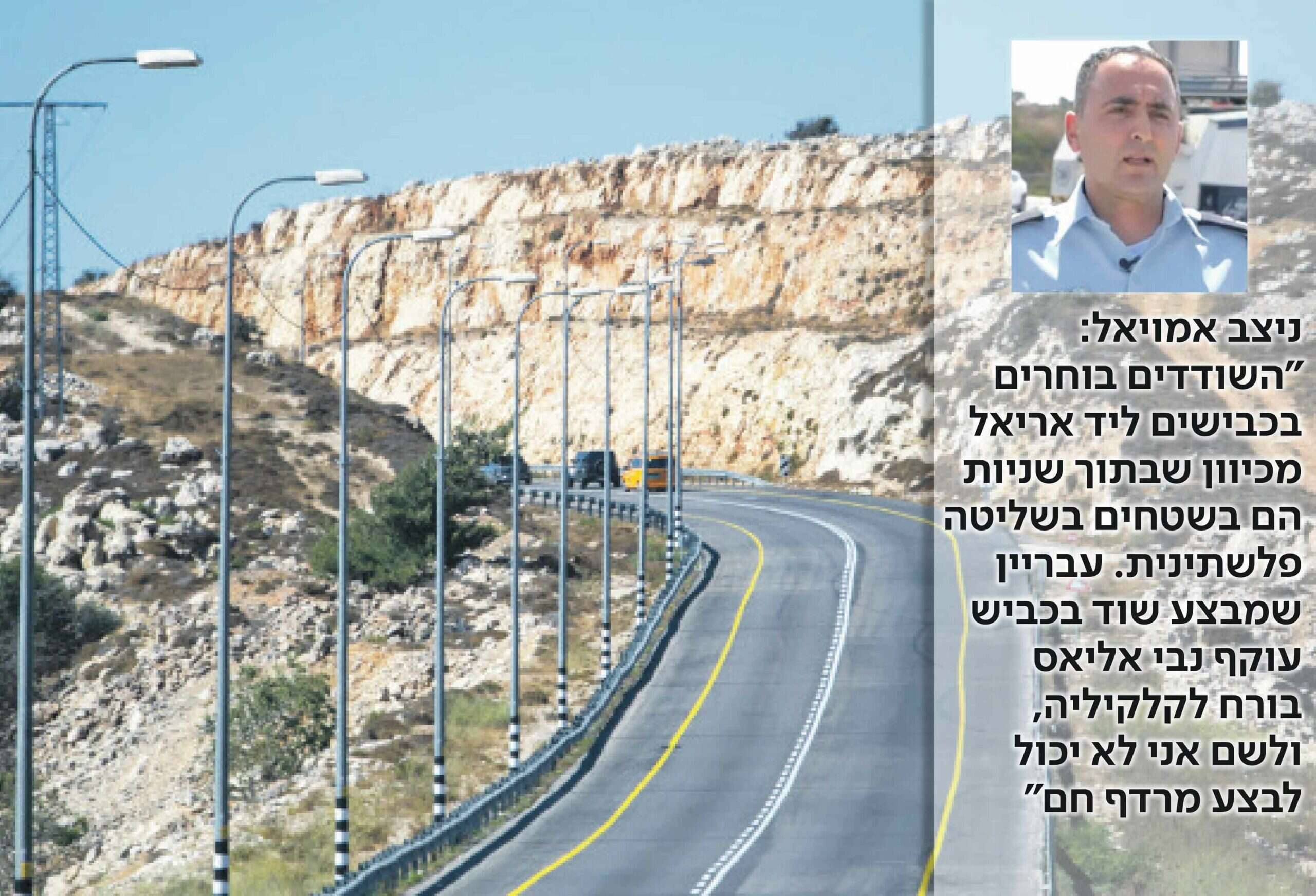 "זה אירוע פלילי בעייתי מאוד, מכיוון שמעורבים בו עבריינים שיש להם אומץ קיצוני ונהגים שיכולים לנסות להגיב ולקפוץ על הרכב, מה שיכול להיגמר בנפגעים בנפש", אומר סגן ניצב ארז אמויאל, מפקד תחנת אריאל, "מדובר באירועים נפיצים מאוד, בטח ביו"ש. השודדים בוחרים בכבישים ליד אריאל מכיוון שבתוך שניות הם בשטחי A ו־B, בשליטה פלשתינית. עבריין שמבצע שוד בכביש עוקף נבי אליאס (מספר 55) נמצא בתוך שניות בקלקיליה, ולשם אני לא יכול לבצע מרדף חם".