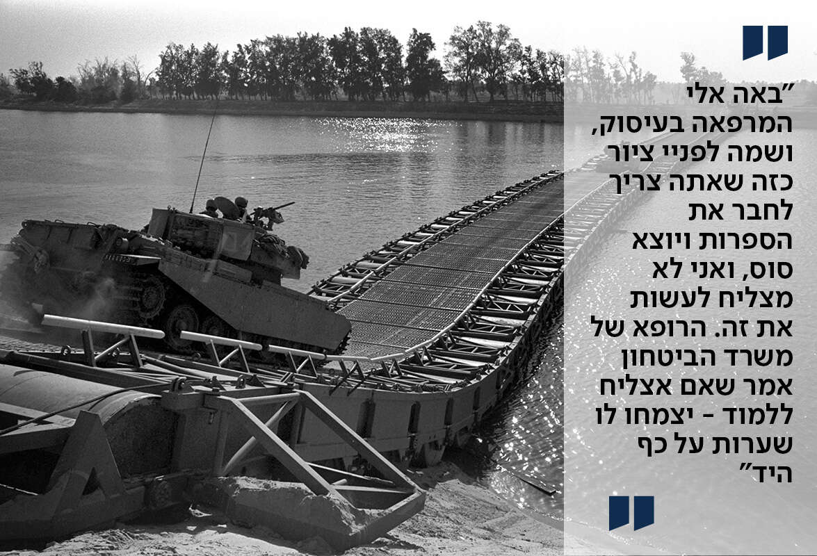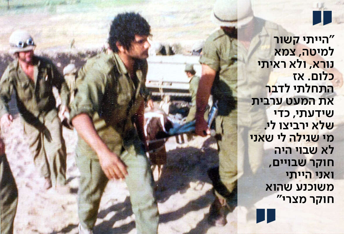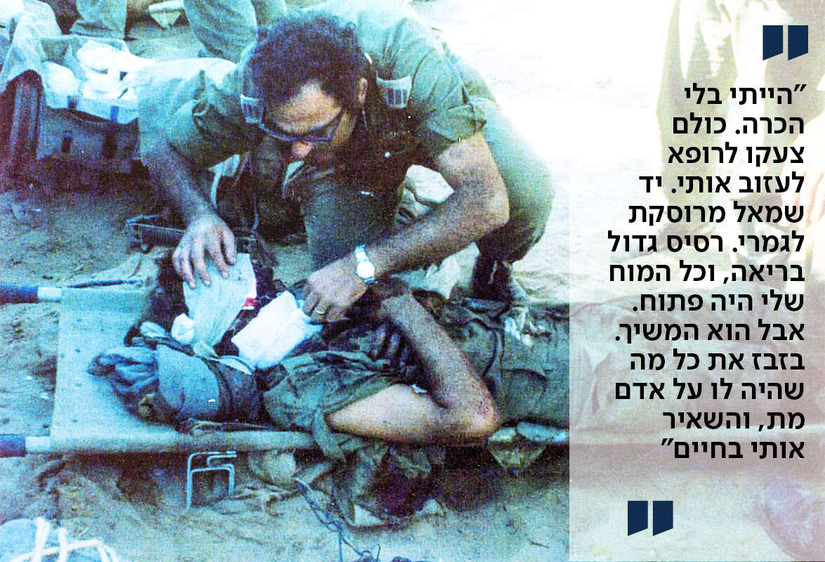 מי שטיפל בו היה הרופא הגדודי, ד"ר אברהם אלירז. "הייתי בלי הכרה. כולם צעקו לו לעזוב אותי, כי אני מת כבר. היד השמאלית שלי היתה מרוסקת לגמרי. היה לי רסיס גדול בריאה, וכל המוח שלי היה פתוח, עם חלקים ממנו בחוץ. כעסו עליו שהוא מבזבז את מעט האינפוזיות שנשארו על אדם מת. זה מנוגד לקוד האתי של הרופא, אבל הוא המשיך. כששאלתי אותו אחרי הרבה שנים למה הוא עשה את זה, הוא ענה לי 'כי השתוללת כל הזמן. לא היה לך כמעט לחץ דם ולא היה לך דופק, אבל היתה בך ויטאליות שמנוגדת לסימפטומים. התנהגת בצורה חיה, ולא יכולתי לעזוב אותך למות. אני עובד היום עם הרבה צוותים רפואיים ואומר להם ש'הרופא הזה בזבז את מה שהיה לו על אדם מת, אבל הוא השאיר אותי בחיים. תראו כמה שאתם לא יודעים, וכמה חשוב לעיתים לשבור את הכללים'".