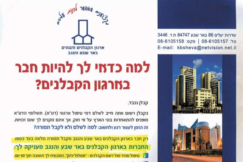 במודעות שפירסם הארגון נאמר בין היתר: "קבלן נכבד, תשלומי דמי טיפול ארגוני מופנים להתאחדות בוני הארץ, אבל אינם מקנים לקבלן רשום שום זכויות... רק חבר בארגון באר שבע מקבל תמורה מלאה לכספו... החברות בארגון מעניקה לו טיפול מהיר מול רשם הקבלנים - 'מסלול ירוק' המבטיח תשובה בתוך 30 יום..."