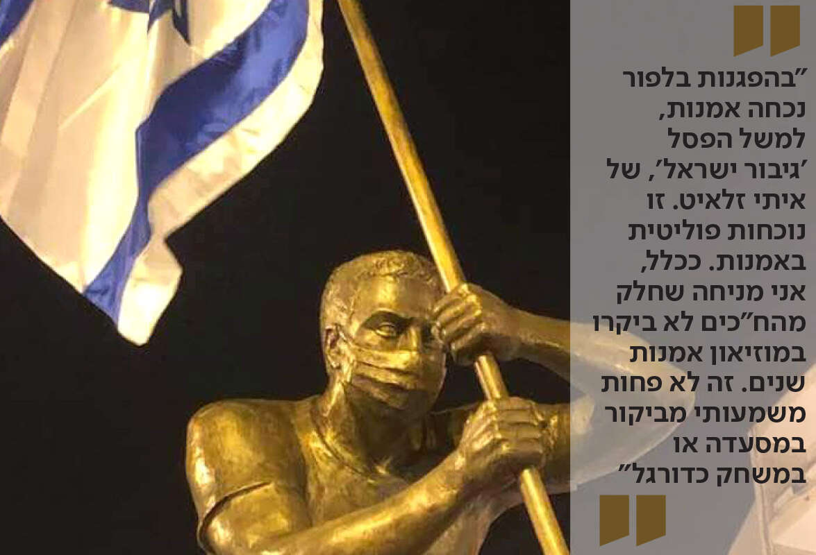 "בהפגנות בלפור נכחה אמנות, למשל הפסל 'גיבור ישראל', של האמן איתי זלאיט. הפסל הוצב בסמוך לבית ראש הממשלה בירושלים ונוצר בהשראת תצלום של מפגין, שכרע כדי להתגונן מפני סילון מים ובידו דגל ישראל. זו נוכחות פוליטית טהורה במעשה האמנותי".