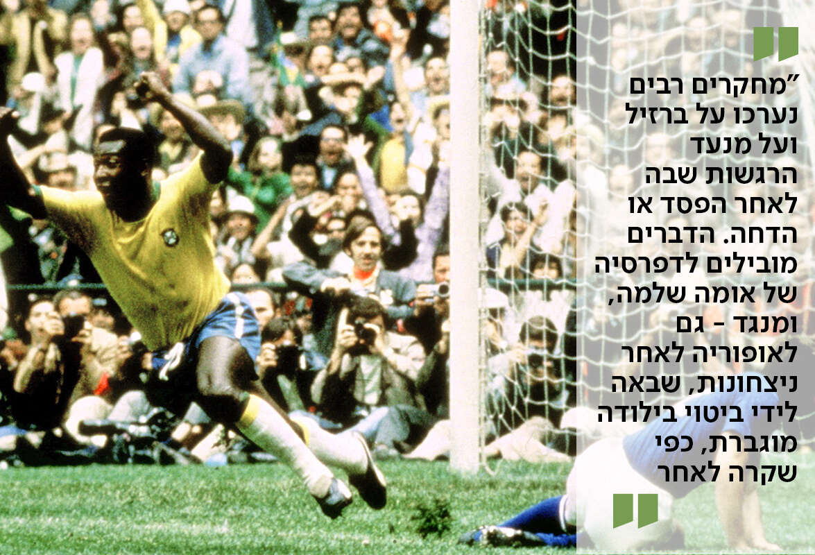 "דוגמה טובה היא ברזיל. מחקרים רבים נעשו על ברזיל ועל הסנטימנט בה לאחר הפסד או הדחה. הדברים מובילים לדפרסיה של אומה שלמה, ומנגד - גם לאופוריה לאחר ניצחונות, שמתבטאת בילודה מוגברת, כפי שקרה לאחר זכייתם במונדיאל 1970. כך שהאופוריה מתורגמת לילודה ולתהליכים כלכליים משני צידי המתרס: או כלכלה גואה, או פשיטת רגל של מדינה. כך, למשל, לאחר שיוון אירחה את האולימפיאדה ב־2004, היא פשטה רגל משום שלא העריכה נכונה את הגלים שהגיעו לאחר מכן. גם בברזיל מתקנים רבים הפכו לפיל לבן לאחר אירוח גביע העולם ב־2014".