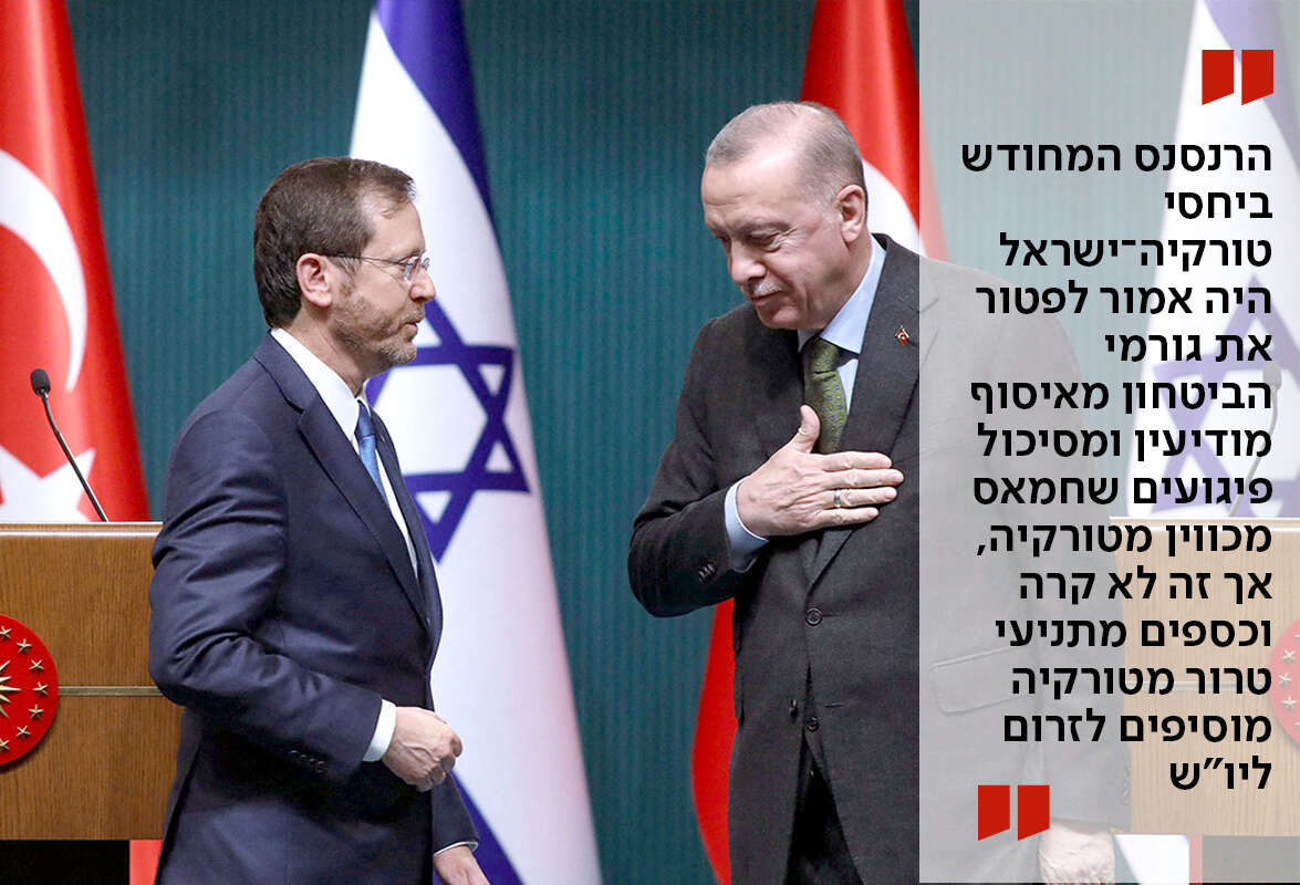 הרנסנס המחודש ביחסי טורקיה־ישראל - כך לפחות האמינו בארץ - היה אמור לפטור את גורמי הביטחון מאחת המטלות היותר רגישות שבהן עסקו בשנים האחרונות: איסוף מודיעין וסיכול פיגועים שחמאס מכווין מטורקיה. אבל המציאות שונה. ככה לא בונים פיוס: גם אם פעילי חמאס באיסטנבול הורידו מעט פרופיל, הרי הניסיונות של חמאס־טורקיה להזרים לשטחי יו"ש, ובפרט לירושלים, כספים מתניעי טרור, להקים בארץ תשתיות חמאס, חלקן מוסוות כמוסדות אזרחיים, ואף להוציא אל הפועל פיגועים - לא פסקו.