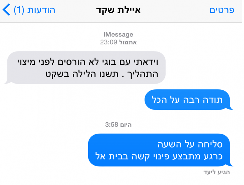 צילום מסך של ההתכתבות בין ראש מועצת בית אל לשקד, הלילה