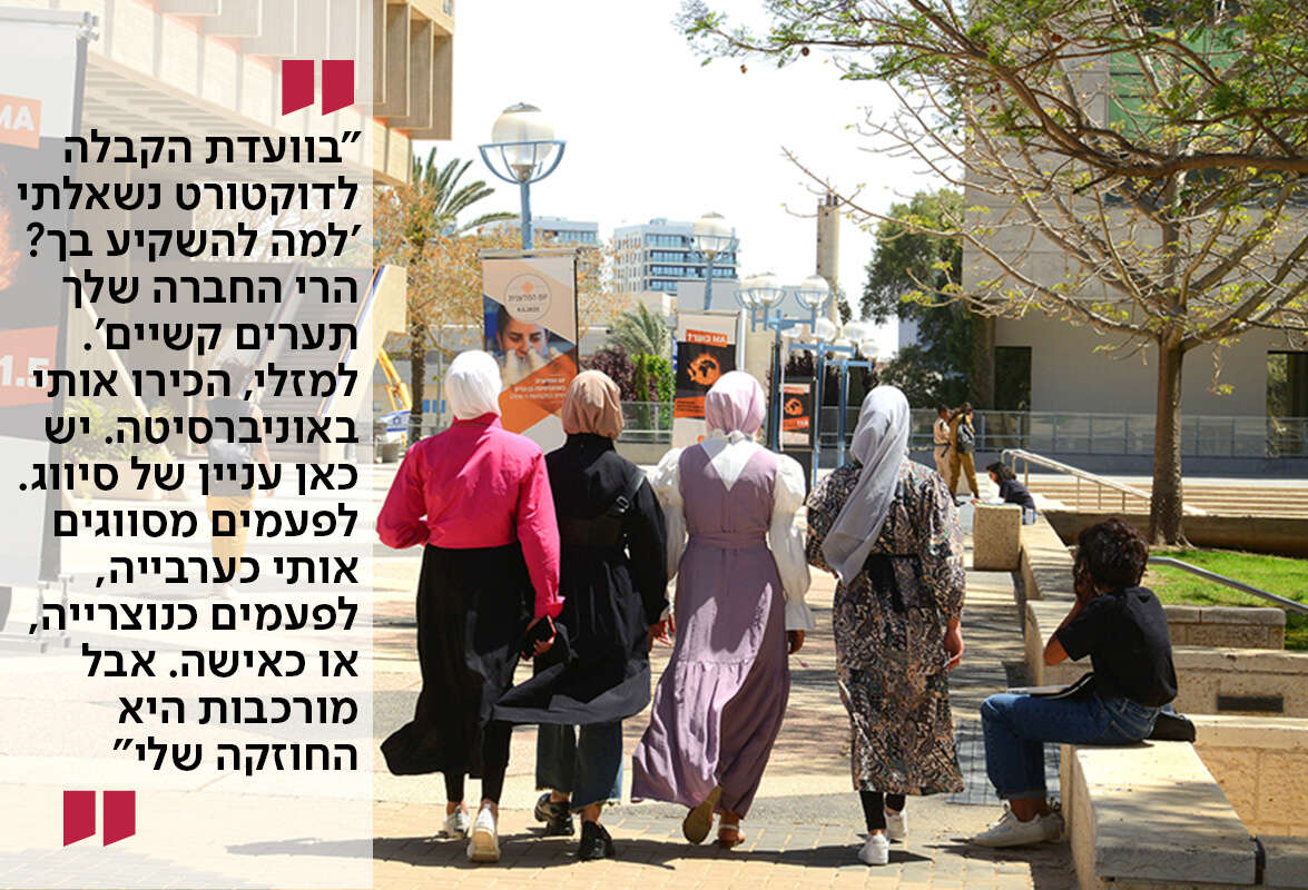 "בנתב"ג, למשל, מסתכלים עלי כערבייה, עם כל הסטריאוטיפים, כאילו יש לי מטען בתיק ואני עומדת להתפוצץ. במהלך חיי אני לא חושבת שחוויתי גזענות, אבל בנתב"ג פשוט הופכים אותך לאדם קטן. וזה לא משנה אם הייתי בדרך לייצג את האקדמיה הישראלית. שם התחושה שלי היא שתופסים ערבים כבני מיעוטים, כמחבלים".