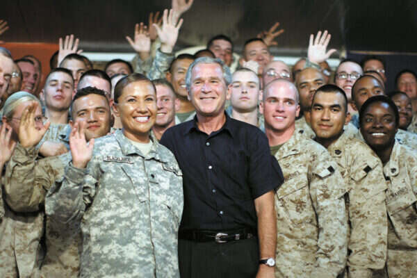 "אני מעריץ גדול של הצבא שלנו". בוש כנשיא ב-2008 עם חיילים אמריקנים בעיראק // צילום: רויטרס