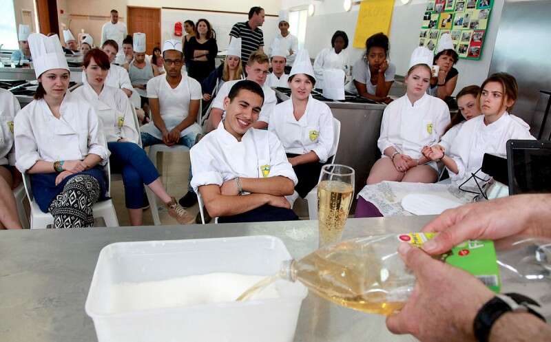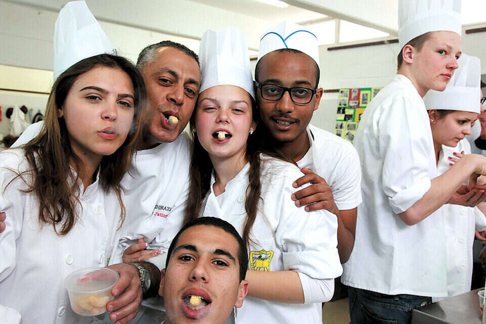 נפתח בעובדה שבית הספר מצדיק היטב את המוניטין שלו כגדול ביותר בתחומו. לומדים בו 4,500 סטודנטים במאות כיתות ללימוד עיוני ומעשי. צוות ההוראה משתמש בציוד המשוכלל ביותר ושומר בקפידה על הסטריליות שלו, וגם מסלולי הלימוד המגוונים מחולקים בדקדקנות: קונדיטוריה, אפייה, טבחות, בישול עילי, קצבות, מלצרות, ניהול מלון ומסעדה, ניהול בר והכנת בירה. כשאנחנו חולפים על פני מכונות ענקיות לעישון נקניקים, גונתר מספר שבשנתיים הראשונות במגמת הקצבות התלמידים לומדים יחדיו על כל סוגי הבשר והנקניקים, ובשנה השלישית כל אחד פורש לתחום הקרניבורי האהוב עליו: חיתוך בשר, חיתוך נקניקים או מכירת בשר לאטליזים. ההיצמדות הזו לפרטים הקטנים בולטת היטב בכל המגמות. במגמת מלצרות, נניח, לומדים כיצד לסדר כיסאות בצורה מושלמת, וגם כיצד לפנות מפת שולחן שהוכתמה ביין ללא הזזת המזון על השולחן, ובלי שהלקוח יראה את צבעו המקורי של השולחן.