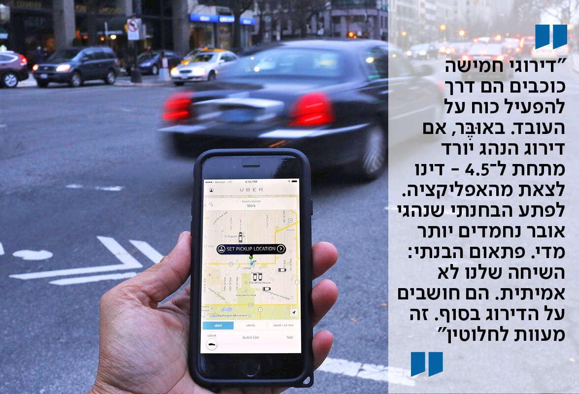 "לפתע הבחנתי שנהגי אובר קצת נחמדים יותר מדי, צוחקים יותר מדי מהבדיחות שלי, קצת מתחנפים. פתאום אמרתי לעצמי: השיחה שאני מנהל איתם היא לא אמיתית. הם חושבים על הדירוג בסוף. זה מעוות לחלוטין. מהצד השני, בארה"ב ראינו תביעה מעניינת נגד אובר: נהגים ממקור אסיאתי טוענים לאפליה נגדם, ולכך שלא משנה כמה הם שירותיים - הציונים שלהם נמוכים.