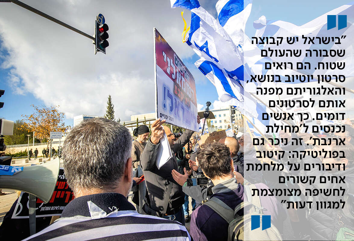"מרגישים את זה גם בפוליטיקה. אנחנו מזהים קיטוב פוליטי, דיבורים על מלחמת אחים, ופעמים רבות זה קשור גם לחשיפה מצומצמת למגוון דעות. טיקטוק, פייסבוק, יוטיוב ותפריטי הבחירה שלהם לא מנסים להפוך אותך לביקורתי, לחכם או לפלורליסט יותר, אלא לגרום לכך שהעיניים שלך יישארו על המסך שלהם".