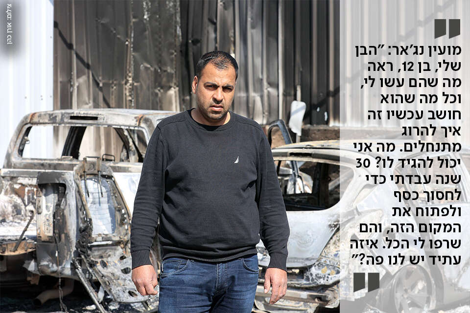 קוראים לו מועין נג'אר, בן 40, תושב הכפר הסמוך איטמה. המוסך שלו קיים שלוש שנים, והוא השקיע בו את כל חסכונותיו. כדי לשרוף אותו מישהו היה צריך לטפס על הגדר ולהשליך פנימה חומר דליק - כנראה בקבוק תבערה. "זאת הפעם השלישית שמנסים לפגוע לי במוסך, אבל הפעם הזאת היא הכי גרועה", הוא אומר. "נגרם לי נזק של 400 אלף שקל. מי יפצה אותי?"