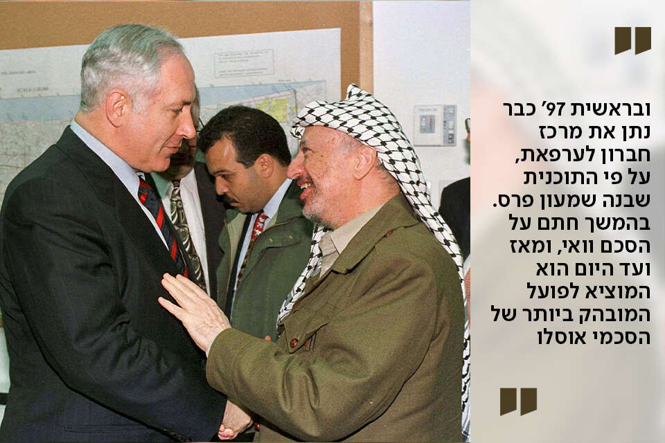 רק שמנהיג הליכוד, כדרכו, עשה את ההפך. כחודש לאחר שנבחר יזם יאסר ערפאת את מהומות מנהרת הכותל, כחלק מהאסטרטגיה שלו להוריד אותנו על הברכיים. נתניהו נכנע, פגש את ערפאת בוושינגטון, ובראשית 97' כבר נתן את מרכז חברון לערפאת, על פי התוכנית שבנה שמעון פרס. בהמשך חתם על הסכם וואי, ומאז ועד היום הוא המוציא לפועל המובהק ביותר של הסכמי אוסלו. תחת הנהגתו מערכת היחסים ביו"ש ממשיכה לנוע בתבנית של הסכמי אוסלו, כאשר מנהיג הימין החזק הוא שפועל לחיזוקה של הרשות הפלשתינית. התוצאות בהתאם.