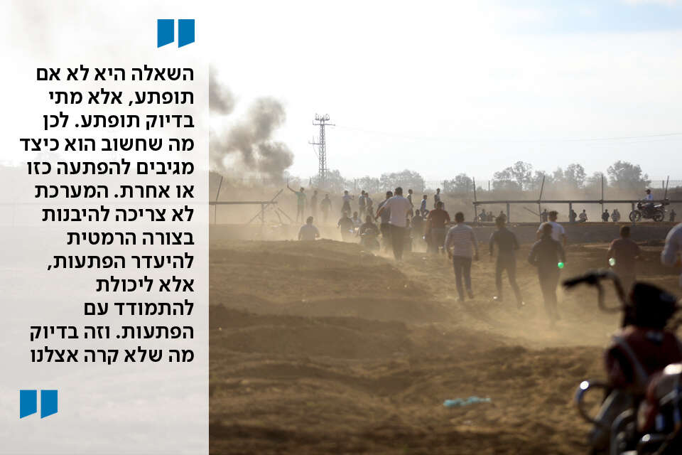 "מערכות מודיעיניות מתאוששות. פעמים רבות, וייתכן שזה מה שקרה הפעם, מגיע מידע אבל לא העריכו אותו נכון. כולם ידעו שהג'יהאד האסלאמי וחמאס עורכים תרגילים מורכבים על הגבול, אבל ניתחו את זה כדרך להפחיד, להפעיל לחץ. בשפה המקצועית, לא הפרידו את האותות מהרעש. היתה פה גם הונאה אסטרטגית. האויב יצר רושם שהוא מוכן להסתפק בהסדרה בעזה, אבל מעוניין להבעיר את הגדה".