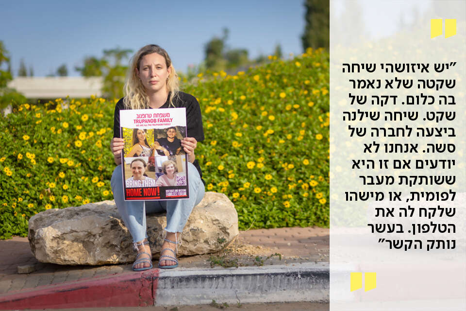 "לצבא יש שלושה קריטריונים כדי להכריז על מישהו כחטוף", אומרת נטע. "הראשון זה הטלפונים שמאוכנים בעזה, השני זה שלא היו סימני מאבק במקום שבו הם התגוררו, והשלישי הוא עדות של בת קיבוץ שראתה אותם מובלים לעזה".