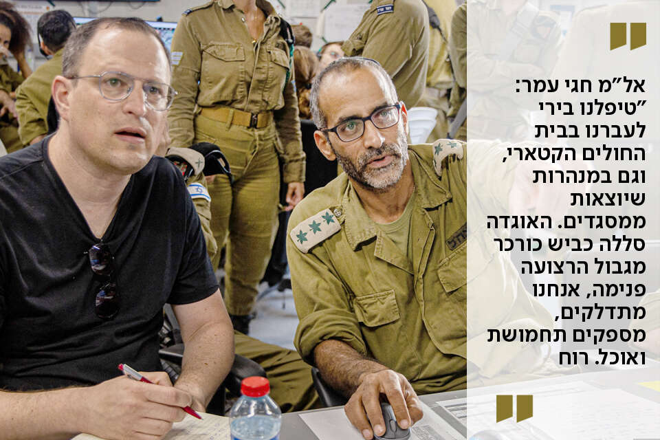 ה"פלזמות" פה, על הקיר, אבל בניגוד למקרים שונים בעבר, המח"טים נמצאים עם הכוחות בתוך עזה, מהיום הראשון של התמרון. "הם אוכלים טונה ורואים את המחבלים עין בעין", אומר איברהים. "יש לזה ערך שלא יסולא בפז. כך גם לכשירות הגבוהה מאוד של הטנקים, כולל אלו שנפגעו ב־7 באוקטובר וכבר שוקמו ונלחמים בחזית. כשאתה מחזיר לפעילות בפלוגה טנק שבו נהרגו אנשים שלך, יש לזה משמעות רגשית אדירה".