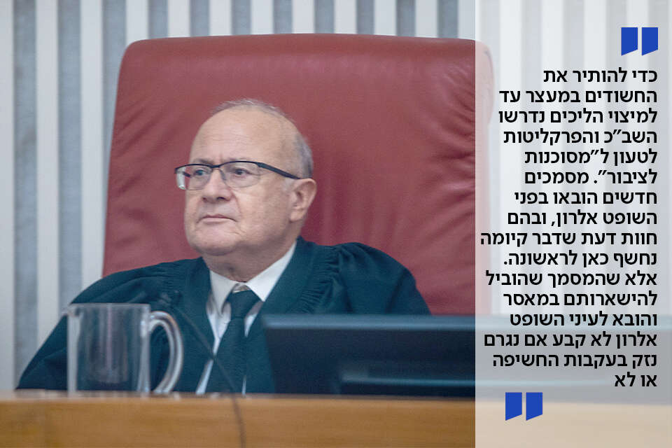 כדי להותיר את החשודים במעצר עד למיצוי הליכים נדרשו השב"כ והפרקליטות לטעון ל"מסוכנות לציבור". מסמכים חדשים אז הובאו בפני אלרון, ובהם חוות דעת שנכתבה רק בימים האחרונים, ובה נכתב מה הנזק שנגרם בעקבות פרסום המסמכים. העיכוב בהצגת המסמך במשך כמעט 20 ימים עוד היה מתקבל אם בתוכן חוות הדעת היה אכן הסבר לאותו הנזק, אלא שמי שנחשפו אליה אומרים: אין שם דבר. אין הסבר ל"פוטנציאל הנזק" שעשוי להיגרם וכלל לא הוכח שנגרם עד לאותו הרגע, חודשיים מאז פרסום המסמך. השורה התחתונה: המסמך שהוביל להישארותם במאסר והובא לעיני השופט אלרון, לא קבע אם נגרם נזק בעקבות החשיפה או לא.