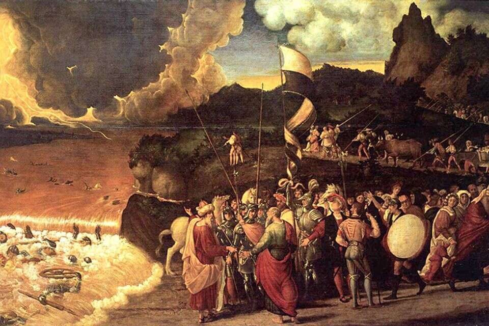 "סוּס וְרֹכְבוֹ רָמָה בַיָּם". מות חיל פרעה בים סוף מאת צייר הרנסנס האיטלקי אנדראה פרוויטלי (Previtali), סביבות 1520-1515, צילום: .