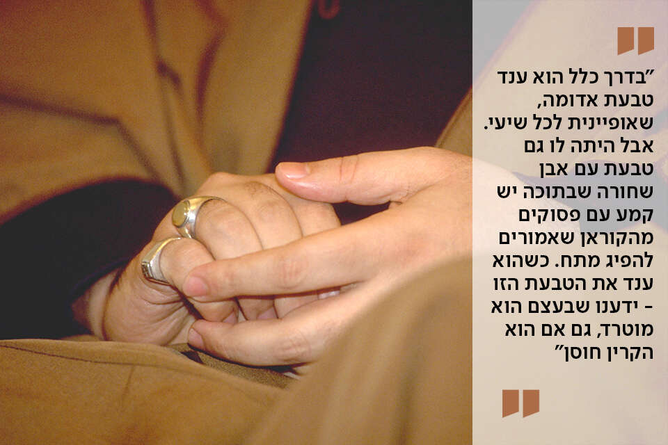 אגב, בכל נאומיו הקפיד נסראללה לשדר חוסן, גם כשאלו נישאו בעיתות משבר או מצוקה. החוקרים מספרים שהיה פרט אחד שסימן עבורם מתי נסראללה בכל זאת במתח, ואפילו בחרדה - הטבעת שענד. "בדרך כלל נסראללה נהג לענוד טבעת אדומה, שאופיינית לכל שיעי", אומרת ק'. "אבל היתה לו גם טבעת עם אבן שחורה שהוא קיבל בצעירותו בנג'ף, ושבתוכה יש קמע עם פסוקים מהקוראן שאמורים להפיג מתח. כשהוא ענד את הטבעת הזו - ידענו שבעצם הוא מוטרד, גם אם הוא הקרין חוסן".