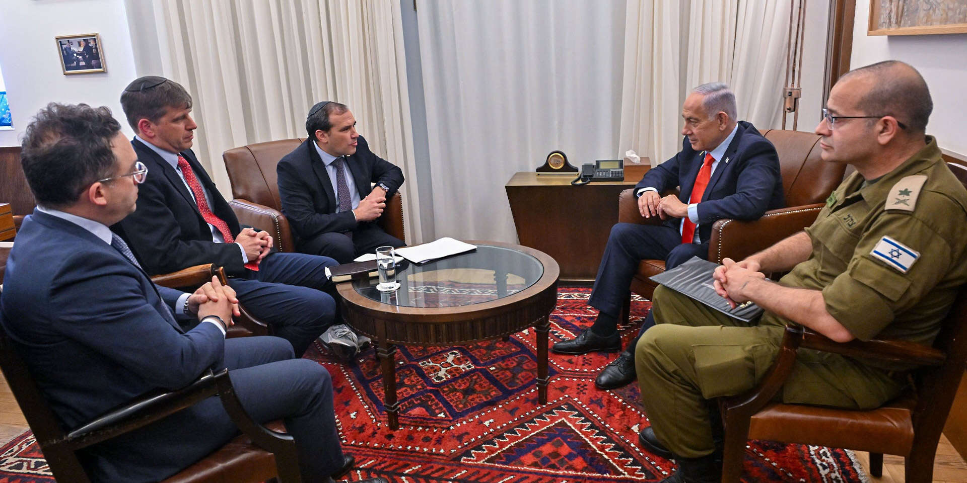 לשמאלו של אייזנברג נראה בתמונה אריה לייטסטון, תושב רעננה והמנהל הראשי של שיקום עזה מטעם ממשל טראמפ. הנציג האמריקני הנוסף, מימין לאייזנברג, הוא היועץ ג'וש גרונבאום, שעובד בצוות של וויטקוף. מולם, כמובן, ראש הממשלה נתניהו והמזכיר הצבאי שלו, רומן גופמן. מי שנעדר ממנה הוא השר רון דרמר, ששהה השבוע בארה"ב ובתוך כמה ימים צפוי להניח מכתב התפטרות.