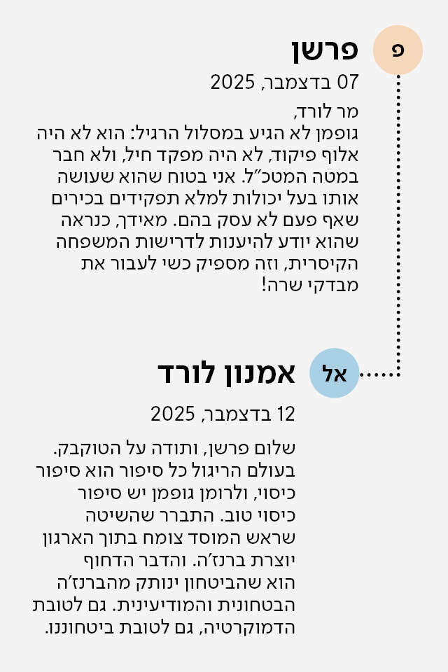 בהמשך לטורו "הבשורה המסתתרת מאחורי מינוי ראש המוסד" (04.12.25), אמנון לורד מגיב לטוקבק של הגולש "פרשן":