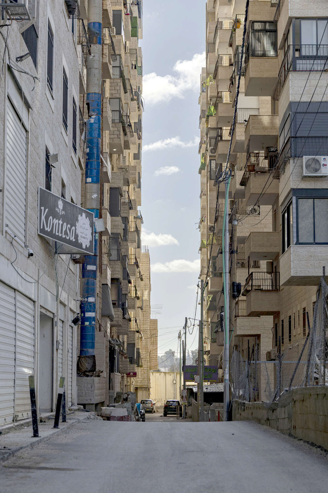 אודי ממליץ לנעמה הצלמת ולי לשחרר את חגורת הבטיחות, כדי שלא יזהו שאנחנו לא מקומיות. החוק הלא כתוב הראשון בארץ שום מקום הוא לא לציית לחוק. בירושלים נוהגים כמו בירושלים, בכפר עקב נוהגים במקרה הטוב בלי לאותת, במקרה הפחות טוב עם פעוטה על הברכיים שאוחזת בהגה וזוג עיניה הגדולות קורנות בגאווה. הבעיה היא שבכפר עקב שעות הנהיגה הן ארוכות במיוחד. צפיפות אנושית, דרכים צרות בין גורדי שחקים, היעדרם של מדרכות ורמזורים, דוכני עסקים על שפת הכבישים – כל אלה יוצרים עומסי תנועה אינסופיים. הכל תקוע. אם תרצה לצאת מכאן לירושלים, תעמוד שוב בפקק במחסום.