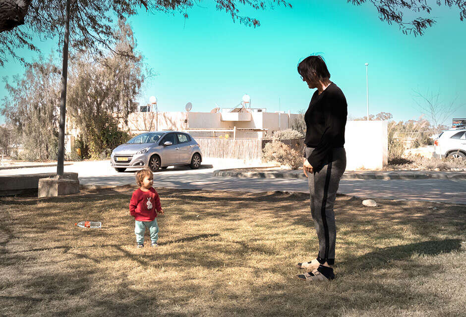 רעות אלינגר, במקור מבאר שבע, משחקת עם בתה, גפן, בת השנה בדשא: "באתי לגור כאן כי זה מאוד פתוח, זה לא שטנץ, יישוב קהילתי הוא יותר פתוח מיישוב חקלאי, אנחנו עדיין מחפשים את הפרופיל של מי שאנו רוצים שיבוא. אבל גם אם אתם לא בדיוק כמו כולם, נקבל אתכם ולא תרגישו שונה".