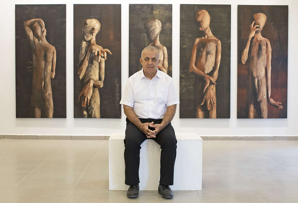 "אנחנו לומדים מטעויות, פעם לא קיבלנו אחריות". אבו שקרה בגלריה באום אל־פחם // צילום: מישל דוט קום // "אנחנו לומדים מטעויות, פעם לא קיבלנו אחריות". אבו שקרה בגלריה באום אל־פחם