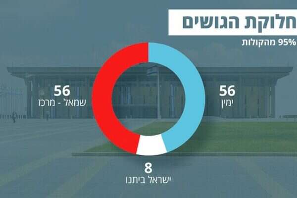 לאחר ספירת 95% מהקולות: לכל אחד מהגושים 56 מנדטים • ליברמן ירד מ-9 מנדטים ל-8 והרשימה המשותפת מ-13 ל-12 • תוצאות האמת צפויות הערב