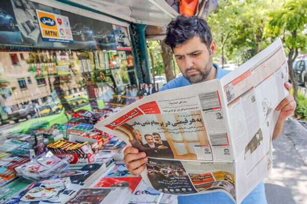 הפלת המשטר באיראן הפכה למלכוד? עובר אורח מעיין בעיתון בטהרן // צילום: אי.אף.פי // הפלת המשטר באיראן הפכה למלכוד? עובר אורח מעיין בעיתון בטהרן