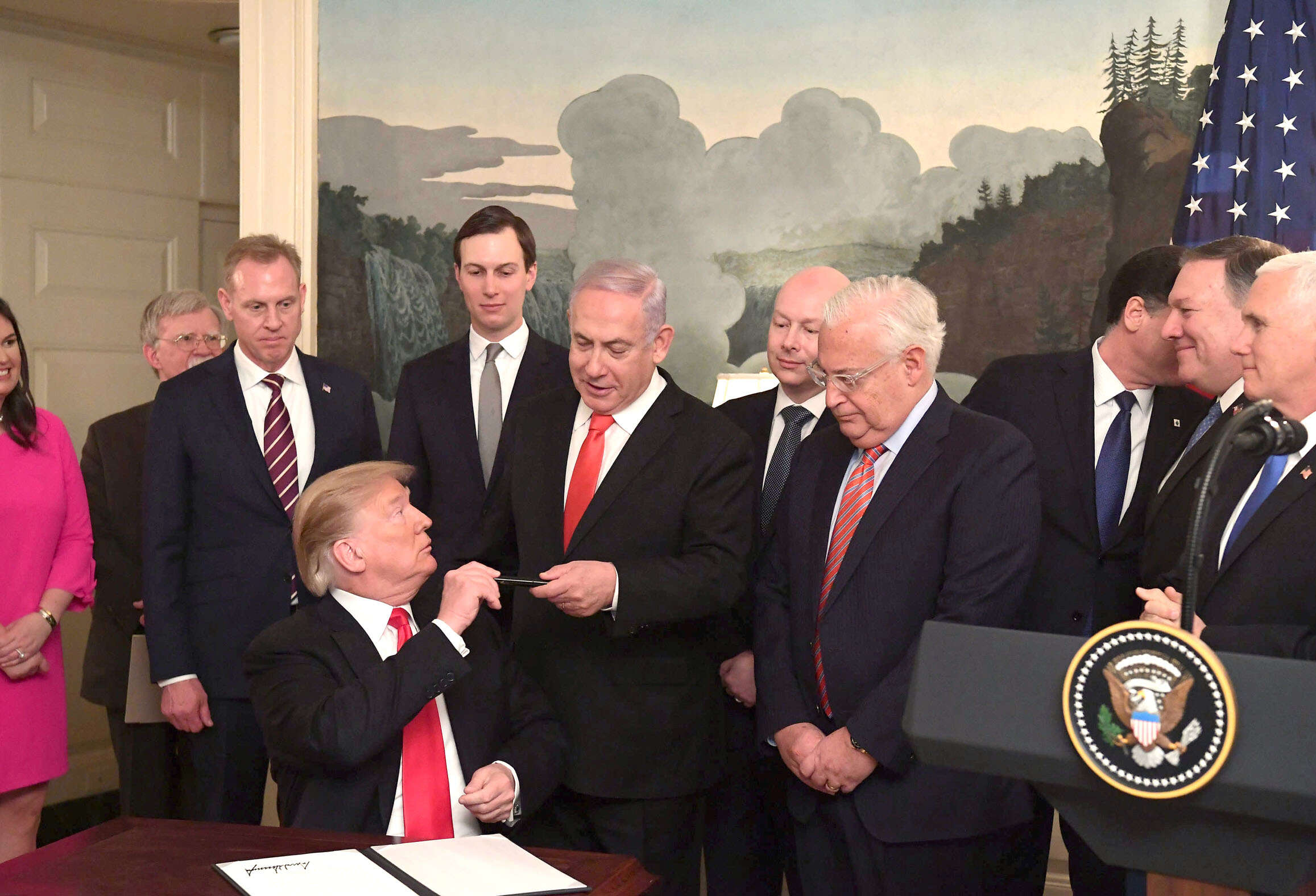 כשהסתיימה הפגישה ליווה טראמפ את נתניהו לרכב השרד. הם שוחחו ואז שאל נתניהו היכן העותק של מסמך ההכרה בגולן שביקש שעתיים לפני כן. האמריקנים, יעילים שכמותם, כבר מסרו את הקופי ליועצי נתניהו, שהניחו אותו באחת ממכוניות השיירה. אבל נתניהו רצה תמונה שלו ושל טראמפ עם ההצהרה בידי שניהם. חיש קל נשלח אחד מהמאבטחים להביא את ההעתק מהמכונית והרגע הונצח. ככה זה בין חברים.