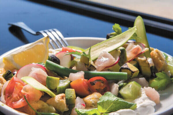 צילום: איתיאל ציון // סלט ירקות אביבי עם דג נא ולבנה. הדג נכבש מעט במיצי הסלט