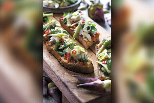 צילום: איתיאל ציון // ברוסקטת ארטישוק נא. פרוסות לב הארטישוק כבושות במעט במיץ לימון