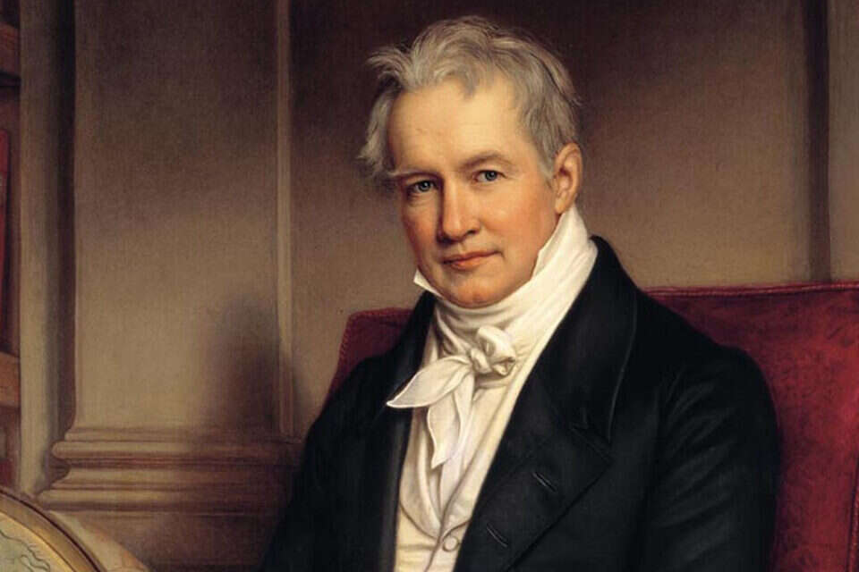 בן למשפחה פרוסית אריסטוקרטית, החל הומבולדט לנסוע בעולם בגיל צעיר - מרוסיה ועד דרום אמריקה. וולף מספרת כי את מסעותיו תיעד בקפידה - בעשרות ספרים וב־50 אלף מכתבים. הכל נרשם, תועד, צויר וקוטלג. ספריו, שתורגמו לשפות רבות, היו כה מבוקשים עד אשר אנשים שיחדו מוכרי ספרים כדי לקבלם ראשונים. תמיד רצה לחקור את הנעלם ולהתנסות "בשלושה דברים בבת אחת".
