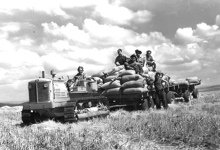 למרות חודשי חורף לא גשומים, ציפו חקלאי צפון הנגב ליבול סביר של שעורה וחיטה, וחלקם רכשו מראש קומביינים מתקדמים וטרקטורים לקראת הקציר. אלא שעונת החמסינים, שהקדימה להגיע ב־1951, הביאה להקדמת העבודה בשבועיים - ולכמויות דגנים מאכזבות. שדות החיטה בצפון הנגב הניבו, למשל, רק מחצית מסך היבול שנקצר באותה תקופה בשנה הקודמת. בצילום: איסוף שקי חיטה בקיבוץ רבדים, 1951.