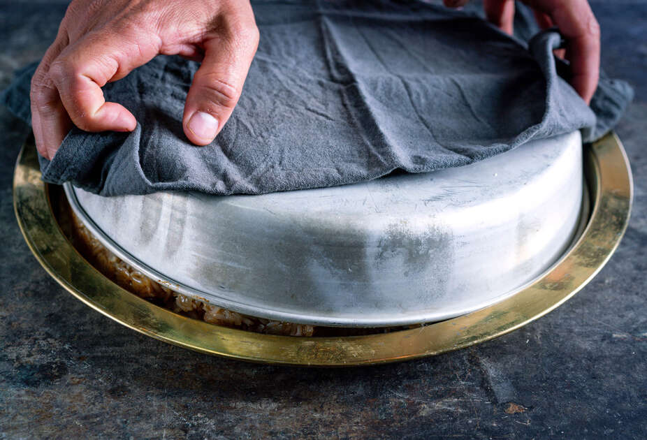 כאשר הסיר מוכן, מוציאים מהתנור, לוחצים את האורז לכיוון הסיר בעזרת צלחת שטוחה או כלי שטוח על מנת לדחוס אותו, הופכים מייד למגש יפה ומעוטר בעלים ירוקים ומגישים חם.