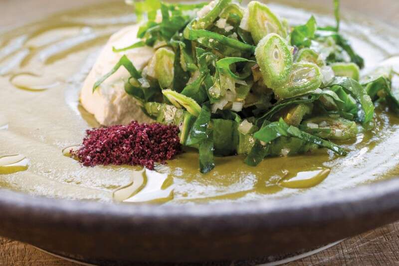 לא רק עונתו של השקד הירוק עכשיו, אלא שלל ירוקים ממלאים את שוקי הארץ. המנה הזאת מגישה אותם כמו שהם, שדה של ירוקים עם קרמיות גבינתית ומעט טעמי עישון מהחציל.