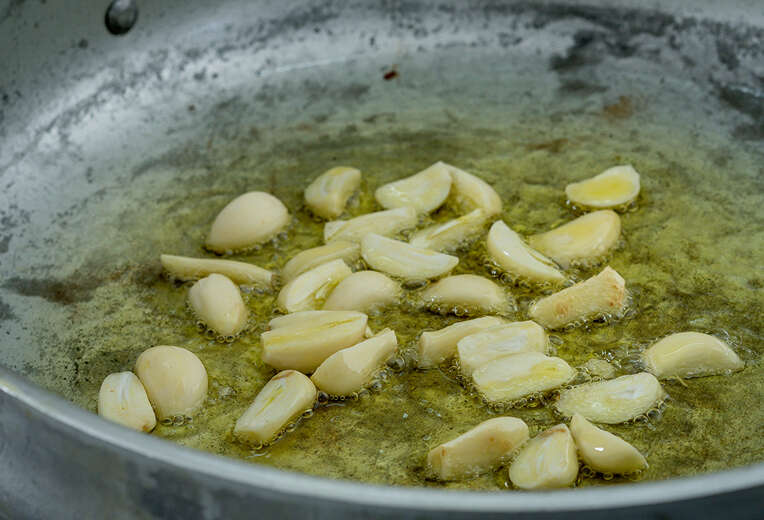 3. בסיר רחב מטגנים את השום בשמן זית כ־2 דקות.