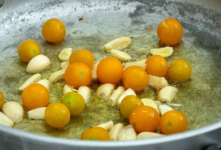4. מוסיפים את עגבניות השרי והלימון הכבוש ומטגנים על להבה בינונית למשך כ־10 דקות.