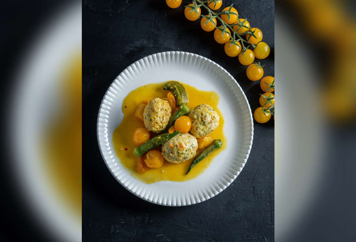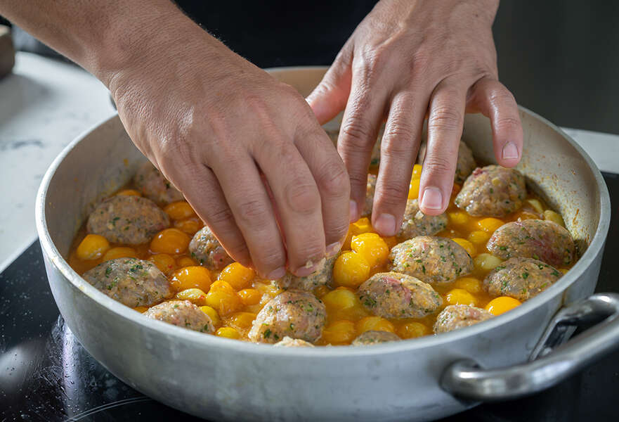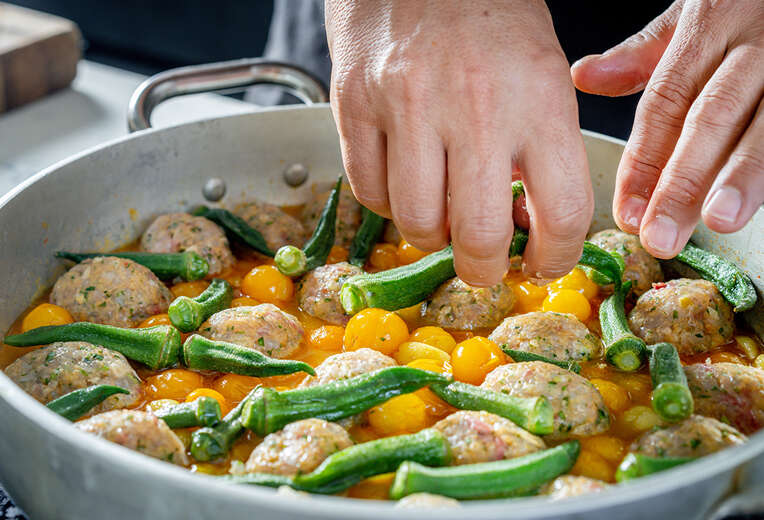 8. בסיר של הרוטב מסדרים את הקציצות והבמיה, מכסים ומבשלים על להבה נמוכה ל־30 דקות.
