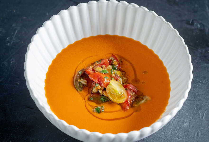 גספצ'ו עגבניות שרי עם סלט עגבניות שרי צבעוניות ואנשובי