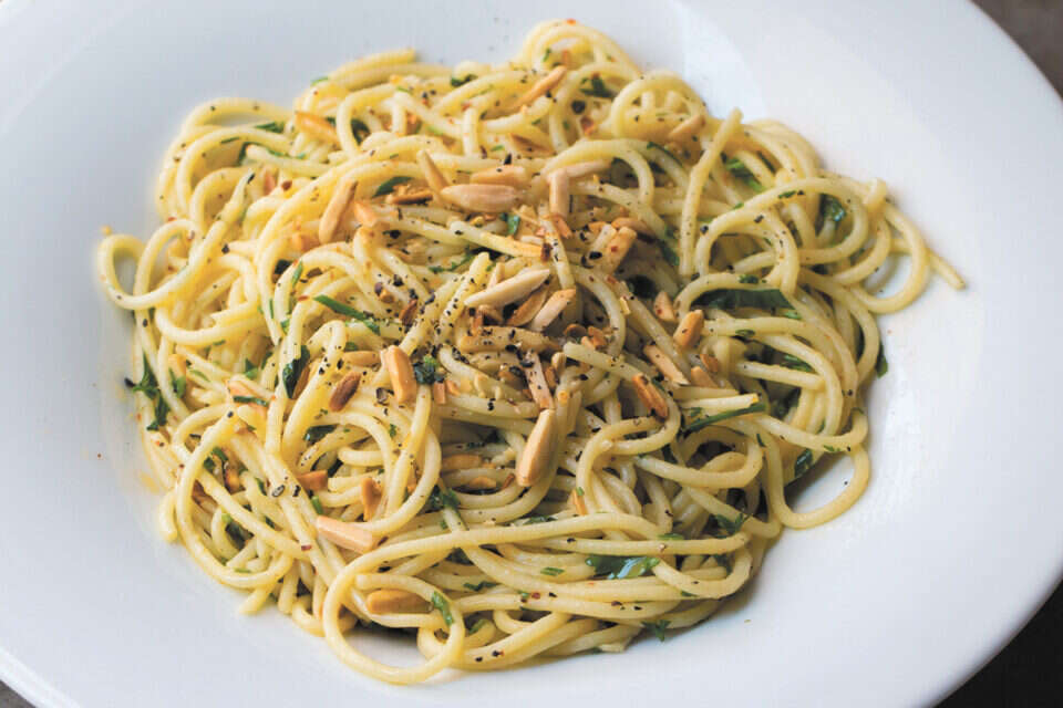 פסטה אליו אוליו ושקדים. חשוב שהספגטי יהיה מעט קשה במרכז, צילום: איתיאל ציון