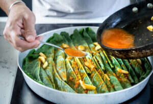 5. שמים מהמילוי על חצי עלה (לאורך) וסוגרים את החצי השני של העלה מעל.