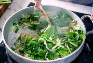 5. קוצצים את עולש הבר, מוסיפים למחבת ומערבבים מעט.