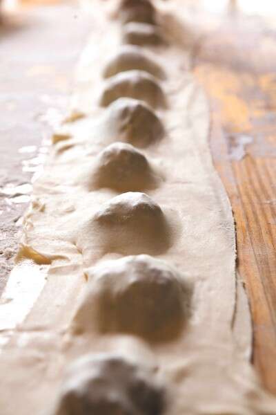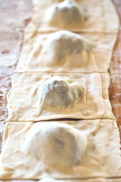 מרדדים את הבצק לעלה דקיק וחותכים רצועות ברוחב כעשרה ס"מ. מניחים על רצועת הבצק כפיות גדושות מהמילוי, במרחק שבעה ס"מ זו מזו. מניחים עוד מהמילוי וככה לאורך הרצועה. מברישים מעט מים בשולי הרצועה ובין התלוליות, להקל את מלאכת ההדבקה של שתי השכבות. מניחים מעל הבצק עם המילוי רצועה נוספת, מהדקים סביב המילוי להוצאת בועות אוויר ובעזרת סכין חדה חותכים לריבועים. מתקבלים רביולי גדולים שבמרכז כל אחד מהם גבעת מילוי. ממש לא דחוף שיהיו אחידים במראה. מהדקים היטב את השוליים.