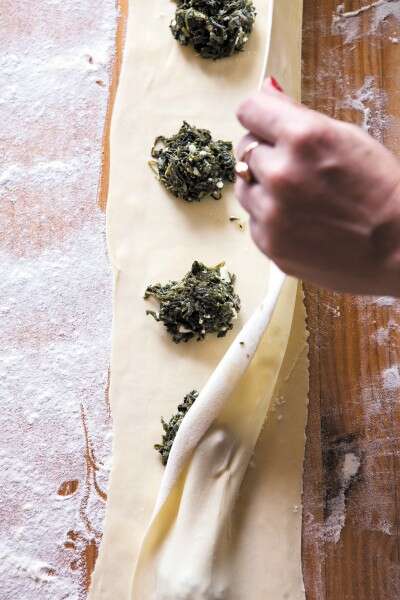 במחבת גדולה או בסיר נמוך מחממים את שמן הזית ומטגנים את כל חומרי המילוי, למעט הגבינה, עד שיימסו לתוך עצמם ויאבדו חצי מהנפח שלהם. מעבירים למסננת ומניחים שיגירו נוזלים. משיבשו המים והצטננה התערובת מוסיפים את הגבינה, מערבבים היטב, טועמים ומתקנים תיבול.