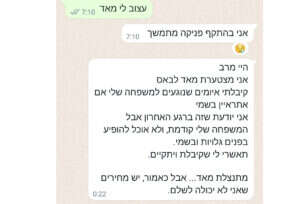 "מי שבוחרת ללכת אחרי הוראת הרבנים שלה, יודעת לשלם את המחירים של האמונה הזאת. כל אחד מאיתנו מכיר את מה שהוא מקבל מזה שהוא משתייך לחברה החרדית ואת מה שהוא מוותר עליו כחלק מההשתייכות הזאת. חלק מזה זה שאותה בת סמינר לא תוכל לעסוק בטיפול. לא יכול להיות שהמחיר יהיה שקרובות המשפחה שלי ובכלל יקבלו טיפול לא מספק. זה כבר מחיר גבוה מדי".