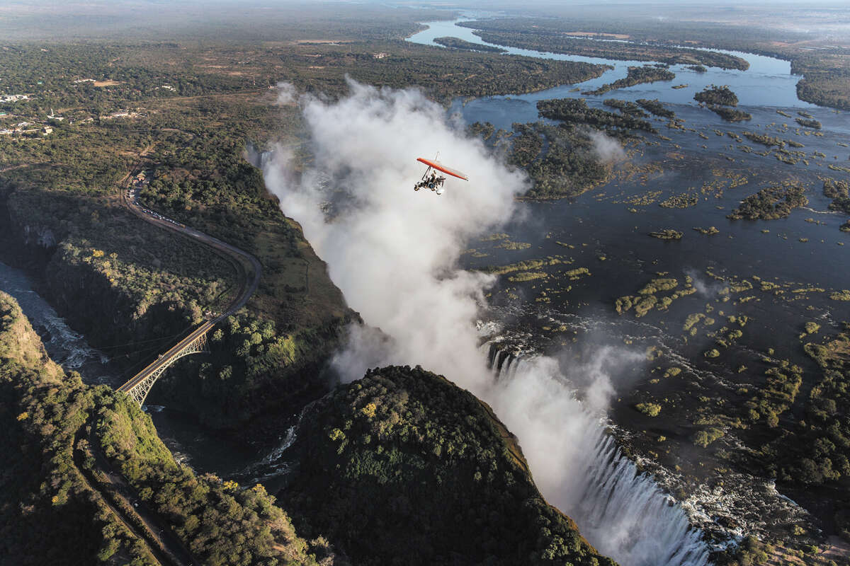 נהר הזמבזי הוא למעשה החיץ הטבעי המפריד בין זמביה לזימבבואה. מפלי ויקטוריה העצומים נחשבים לאתר מורשת של אונסק"ו, והם מהגדולים ומהמרשימים בעולם: מפל פראי באורך 1.7 ק"מ, בעומק של כ־100 מטר, עם זרימה של 450 אלף קוב מים לשנייה. במהלך שהותי באזור ביקרתי במפלים שמונה פעמים, בכל פעם מזווית שונה ובשעה אחרת. אבל גולת הכותרת היתה לחזות בהם בטיסת מקרו־לייט - מעין טרקטורון מעופף. כשהמיסיונר הסקוטי והחוקר ד"ר דיוויד ליווינגסטון ראה את המפלים לראשונה, הוא אמר: "זה מראה כל כך יפה, שהוא בוודאי נצפה על ידי מלאכים במעופם". הגשר בתצלום, גשר ויקטוריה, הושלם לפני 110 שנים, ונחשב אז לפלא הנדסי ולגשר הארוך בעולם. הוא תלוי באוויר, ואת מאות טונות הפלדה לבנייתו סחבו פילים.