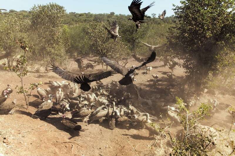 אחד מבתי ההארחה שבהם ביקרנו משתמש בשאריות הבשר כדי להאכיל את הנשרים המקומיים, בכל יום בשעה 1 בצהריים. כבר בחמישה לאחת מתייצבים באוויר מאות נשרים שמחכים לארוחה, חלקם אפילו נוחתים על העצים בסמוך למקום הקבוע שאליו יגיע אחד הטבחים עם השלל היומי. באחת אפס אפס, כאילו קיבלו זימון בווטסאפ, נאספים כ־200 עופות על הקרקע. הטבח פורק את הארגז, וברגע שהוא לוקח צעד אחורה מתחילה מלחמה של צרחות ודחיפות בענן אבק. בתוך דקות ספורות מפרקים הנשרים קילוגרמים שלמים של בשר, בעוד אנו עומדים כחמישה מטרים מהם.