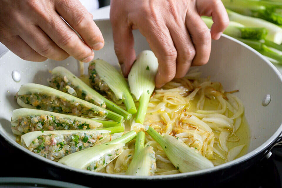 4. מסדרים את השומרים הממולאים מעל הבצל.