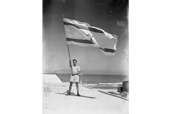 צעיר מניף את דגל ישראל בחוף תל אביב, תחילת שנות ה־50. צילום: זולטן קלוגר, לע"מ