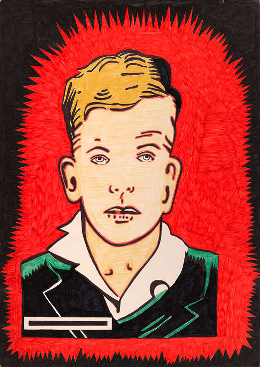 אנחנו עומדים מול הסדרה שמוקדשת לעבודה בעט כדורי. זו אסופה של פורטרטים, חלקם מבוססים על כרזות קולנוע ישנות מהונג קונג, ובה לכל פרצוף יש מאפיינים ברורים. גבר אחד מזכיר לי את חסן מלך מרוקו, אישה מזכירה את הזמרת הלבנונית פיירוז, ואחרת דומה למרב מיכאלי. "מיכאלי דווקא אישה יפה, אבל אני אף פעם לא מעתיק מצילום או מהתבוננות באובייקט", מחייך גולדשטיין. "אנשים מחפשים חומרים על מי שהיו במשפחתם ונספו, אני בסופו של דבר 'מייער' את העבודות שלי עם פרצופים שלא הכרתי, אבל היו מאוד נוכחים ומשמעותיים בחיים שלי".