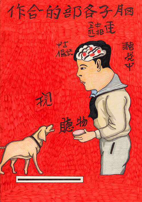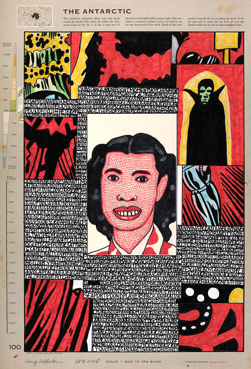כל סדרה והקיר שלה, כל אחת והנושא שלה. עבודות בעט כדורי, בטושים, בעפרונות מחודדים, ומדבקות שרובן מצוירות על נייר עם עבר - דפי אטלס ישן או כריכות ספרים. גרי אומר שהוא אף פעם לא מנהל דיאלוג ישיר עם מה שהודפס על הדף, אבל הוא בטוח שמשהו מעברו של הנייר נכנס לתוך רעשי הרקע בזמן הציור. עבודות שבמבט ראשון, בחסדים קטנים של ראייה מרחוק, אפשר לטעות בהן, אבל אז מתקבע המבט, ומתוך עליצות הצבעים עולים כאב הפרטים ונשיכת הנושאים.
